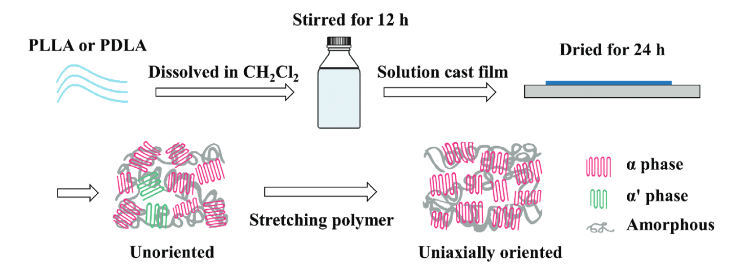 Schematic diagram of the fabrication process of stretched PLLA and PDLA polymer films. |
