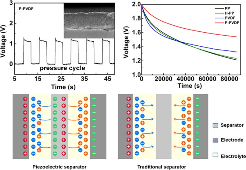 Schematic illustration of the self-discharge processes of supercapacitors with piezoelectric and traditional separators. |