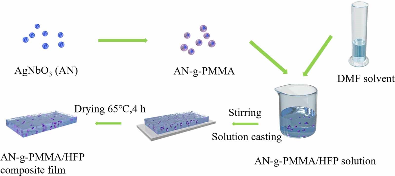 Schematic diagram for the fabrication process of the AgNbO3-g-PMMA/PVDF-HFP (AN-g-PMMA/HFP) nanocomposite film. |