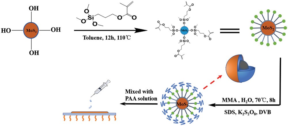 Schematic diagram of the fabrication process of the MoS2-g-PMMA/PI (where PI is polyimide) nanocomposite films. |