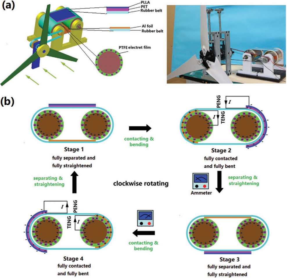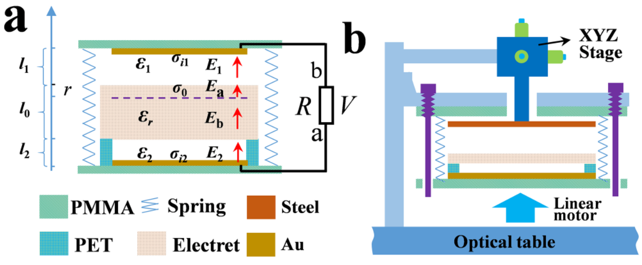 Schematic drawings of (a) the MENG-based sensor and (b) the experimental setup. |
