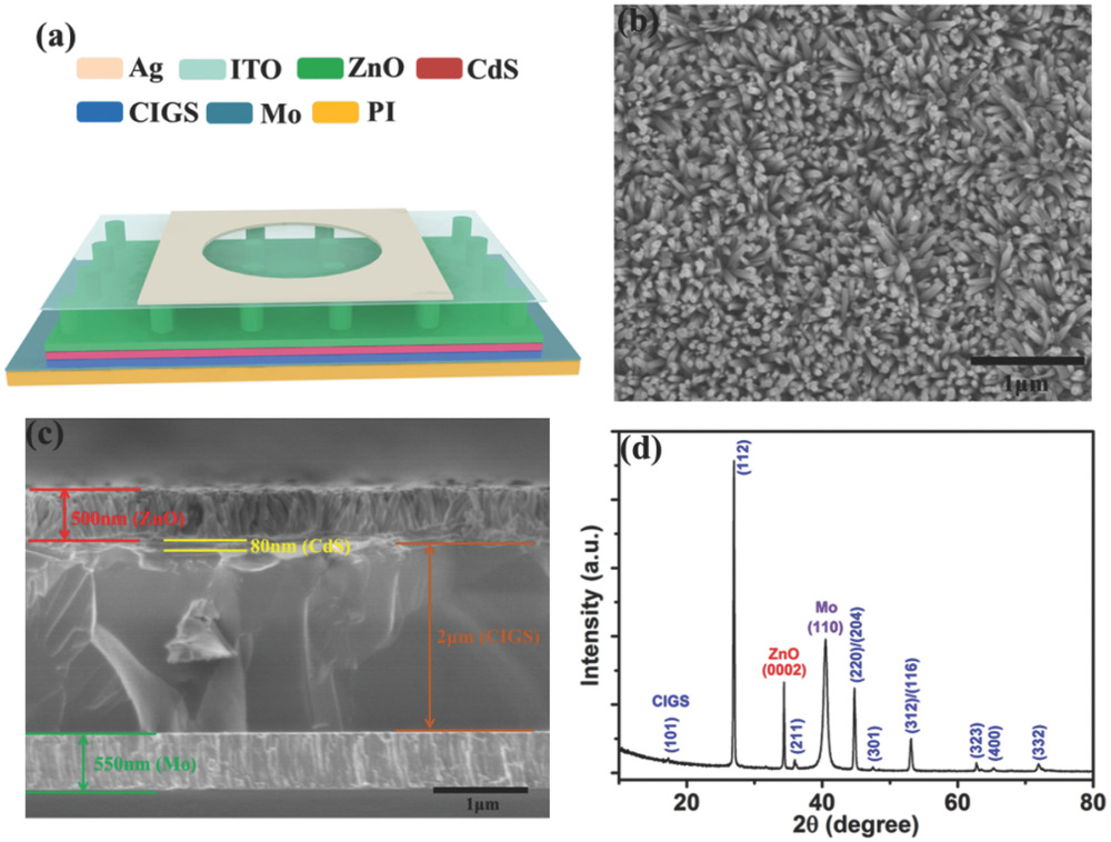 a) Structure diagram of ITO/ZnO/CdS/CIGS/Mo/PI photodetector. b) SEM top view image of ZnO nanowires. c) SEM cross‐section view image of the ZnO/CdS/CIGS/Mo sample. d) XRD diffraction pattern obtained from the device.