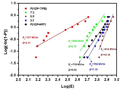 The characteristic Weibull breakdown strength reached 814 MV/m when the ratio between the PVDF-TrFE and PVDF-HFP composition was 5:5. |