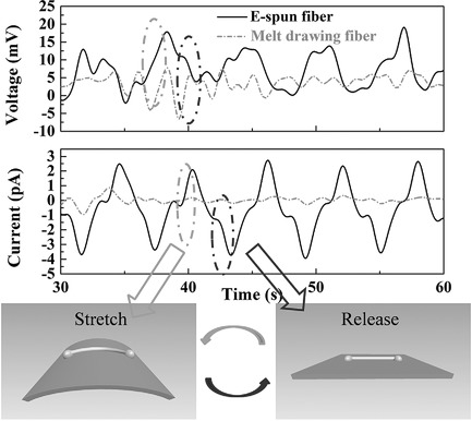 Comparison voltage and current output for an electro-spun PLLA nanofiber and a melting drawn PLLA nanofiber, where both PLLA fibers were treated with annealing and supercritical CO2 treatment. |