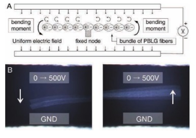 Schematics of fi ber bundle bending test (A) and movement of fi ber bundle at the left end (left panel) and right end (right panel) in response to a 500 V downward uniform electric fi eld (B). |