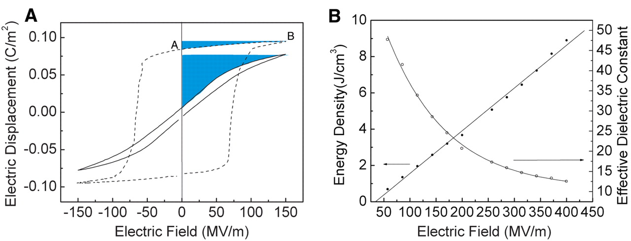 (A) D-E loops for P(VDF-TrFE) 75/25 mol% (dotted lines) and P(VDF-TrFE–CFE) 58.3/34.2/7.5 mol% (solid lines) measured at 10 Hz. The shaded blue areas indicate the energy density. (B) The discharged energy density measured from the D-E loops and Keff as a function of the field amplitude. The solid curves are drawn to guide eyes. |