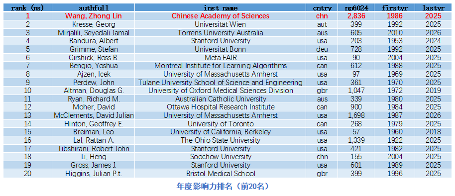 2025年9月19日,全球最大学术出版商Elsevier与斯坦福大学公布新一期世界“标准化引文指标全科学作者数据库”(统计数据自1788年起截止到2025年8月1日),即全球前2%全科科学家职业生涯影响力(Career-long impact)排名数据库(共计230,333人)和单年度影响力(Single year impact)排名数据库(共计236,313人)。